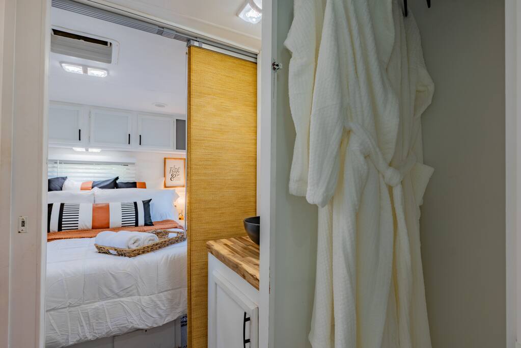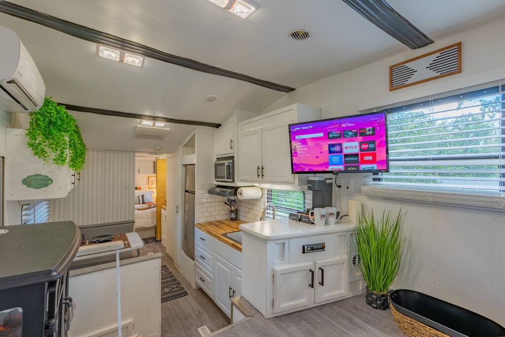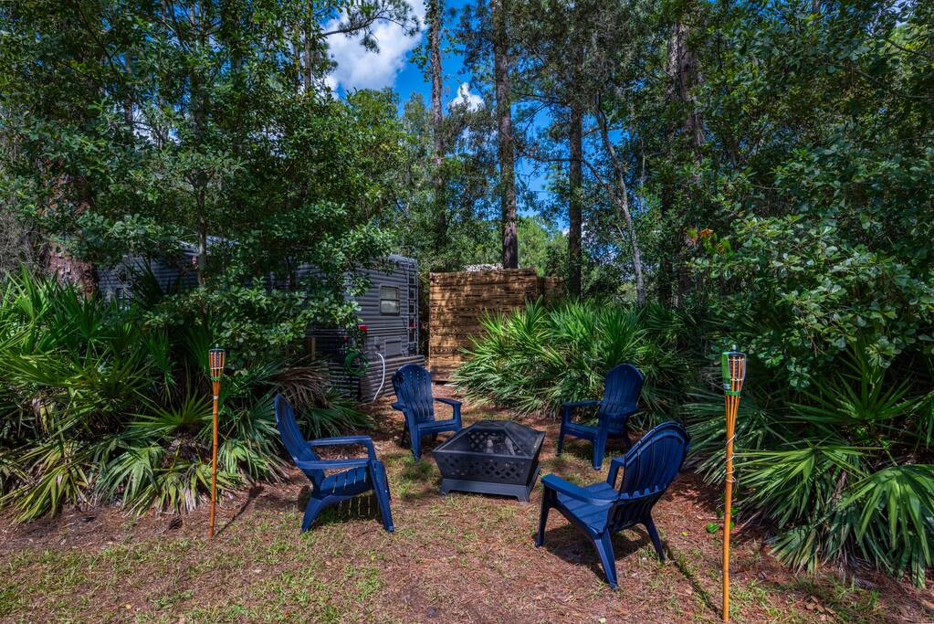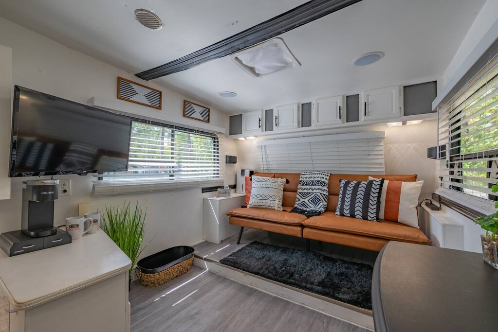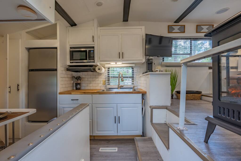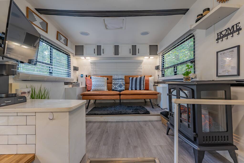 Guests have full access to the entire Rustic Retreat tiny home RV, including the cozy indoor living spaces, bedroom, bathroom, dining nook, and kitchen area. Outside, enjoy the private outdoor rainfall shower, fire pit lounge, and lighted pathways. Parking is available in the designated space for your cabin. You’ll have the entire space to yourself — no shared areas.
