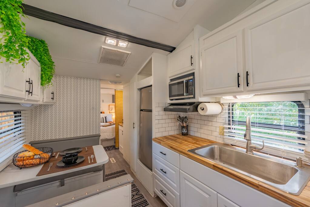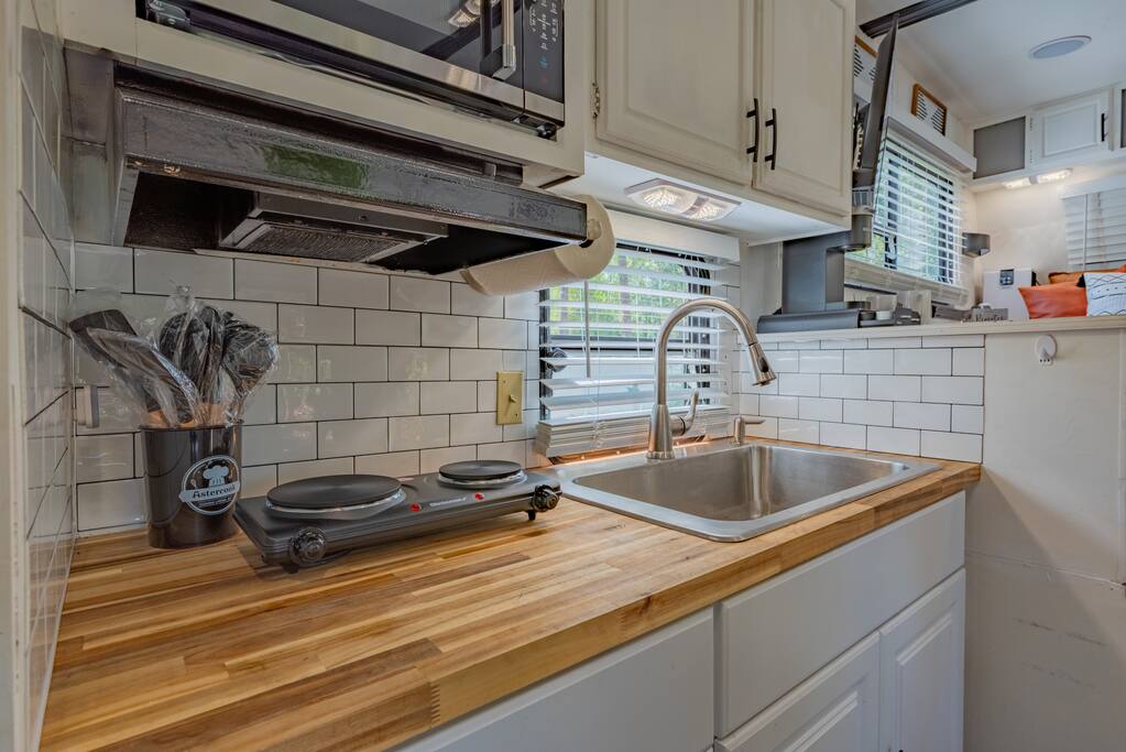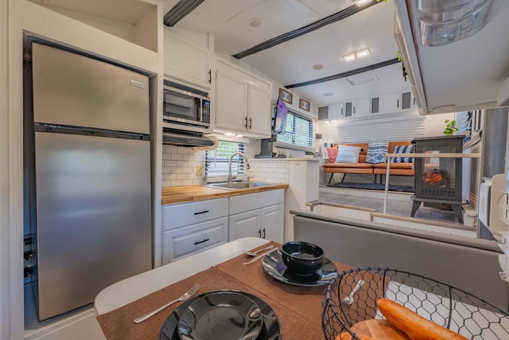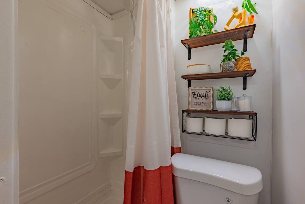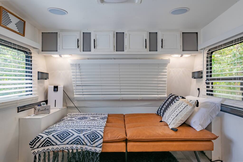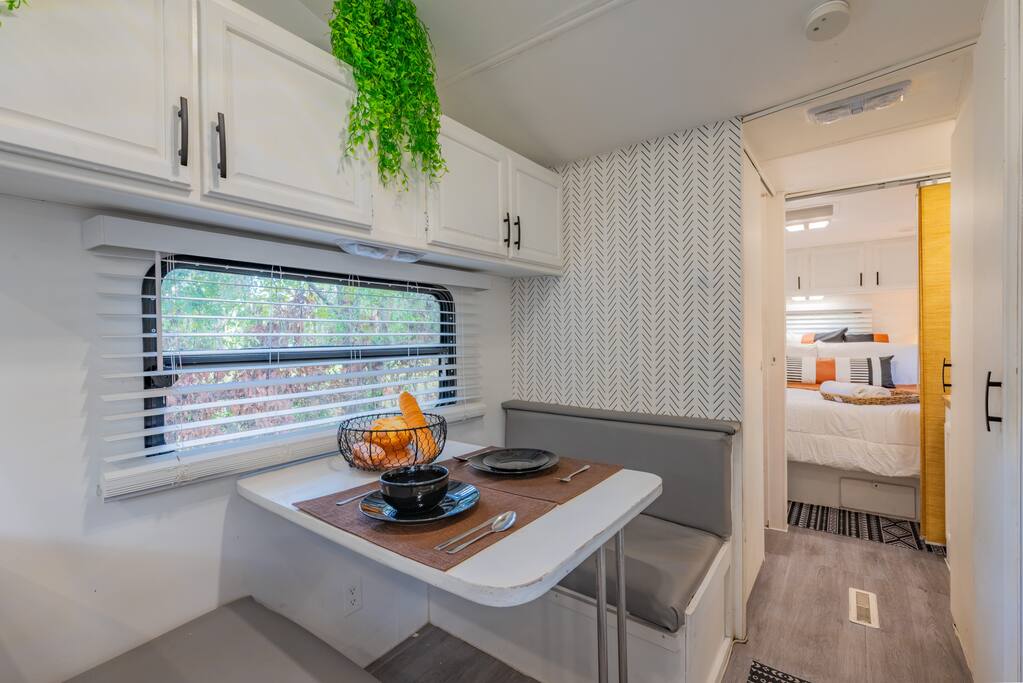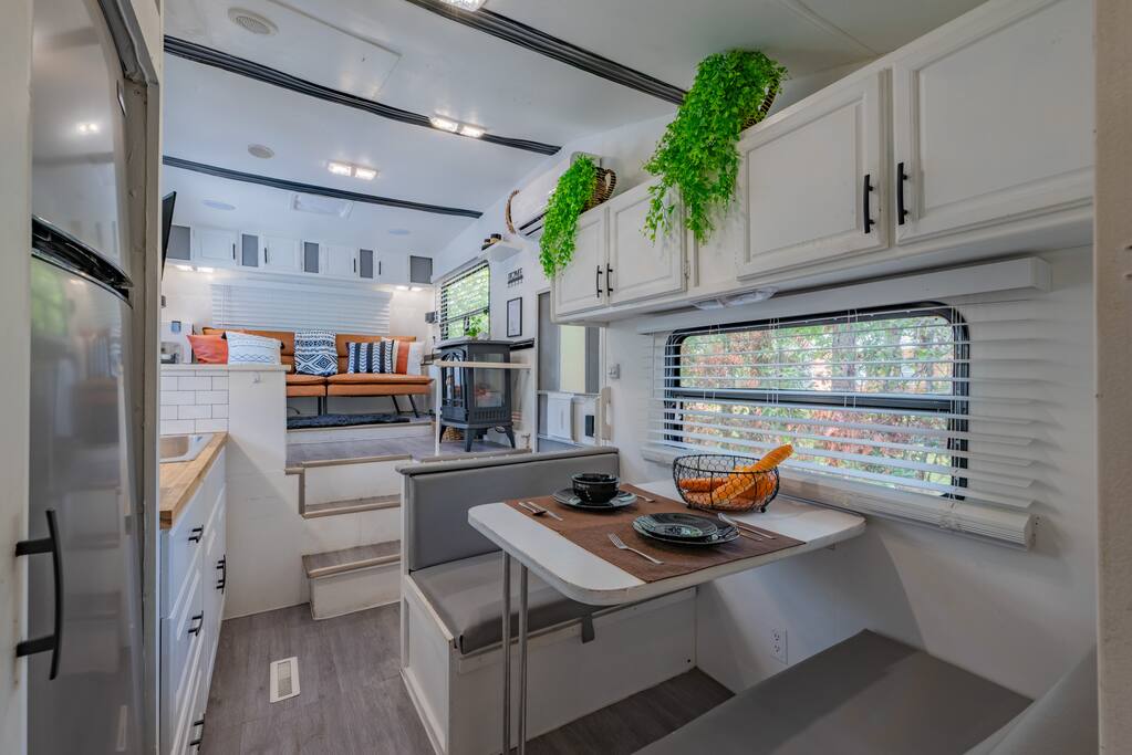 Guests have full access to the entire Rustic Retreat tiny home RV, including the cozy indoor living spaces, bedroom, bathroom, dining nook, and kitchen area. Outside, enjoy the private outdoor rainfall shower, fire pit lounge, and lighted pathways. Parking is available in the designated space for your cabin. You’ll have the entire space to yourself — no shared areas.